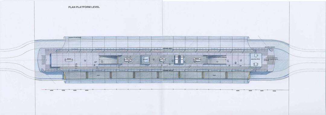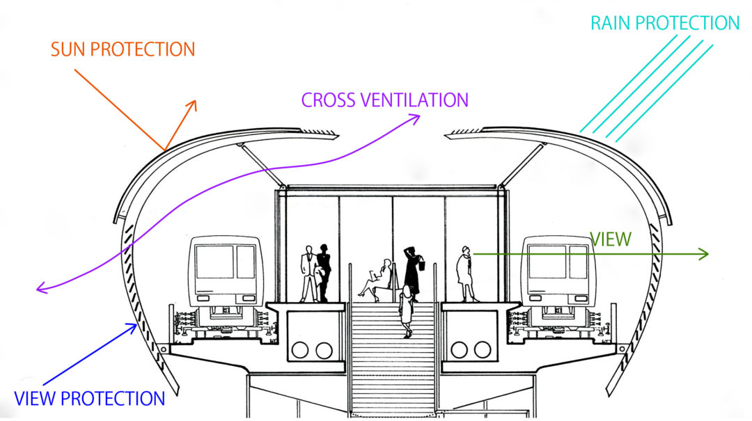 プラットホーム部分の半半に分けたチューブのようなルーフシェルは内間を気候の影響から守るために考えられました。逆に乗客が受けるスケールで考えたガラスと鉄のプラットホームの内間はルーフシェルの構想的なベースになります。かなり風圧を受けることになりそうですが、その風圧を減らすこと、自然の風の流れを内部に入れること、それから景色を見せることのためにルーフシェルは部分的にルーバータイプとなりました。プラットホームの目隠し部分に対してコンコースレベルはかなり透明です。平均で15メーターの高さに上った時の事を楽しむために考えた設計です。